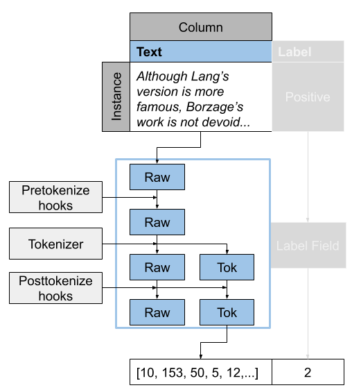 We can see that our hooks worked: the raw data was lowercased prior to tokenization, and the punctuation is not present in the processed data. You can similarly define other hooks and pass them as arguments to your Fields. It is important to take care of the order in which you pass the hooks – they will be executed in the same order as you passed them to the constructor, so take care that you don’t modify some aspect of data crucial for your next hook.